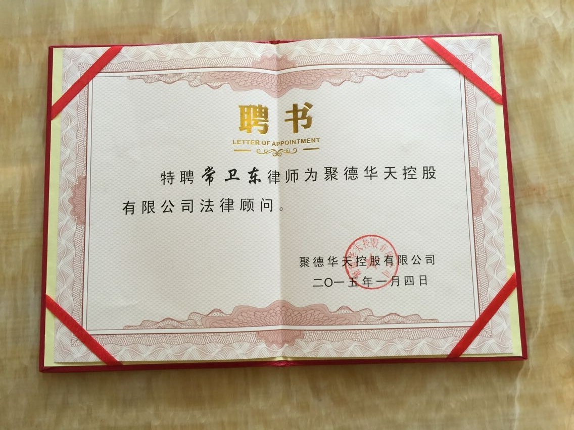 2015年1月4日常卫东律师被聘为聚德华天控股有限公司法律顾问